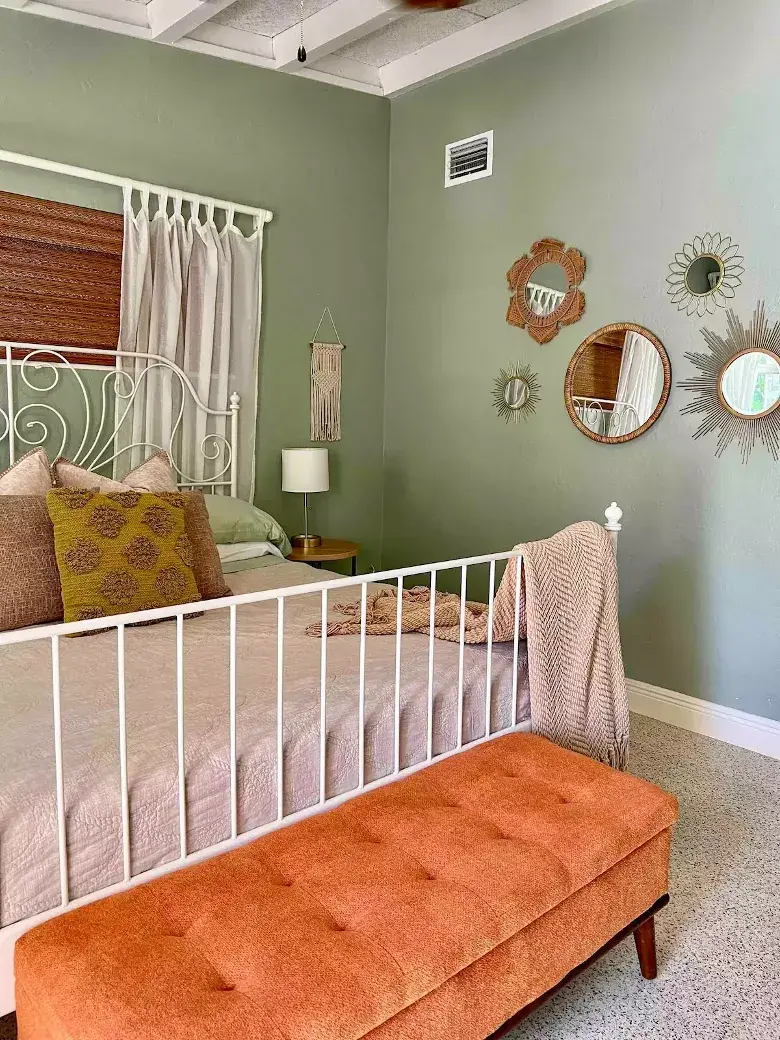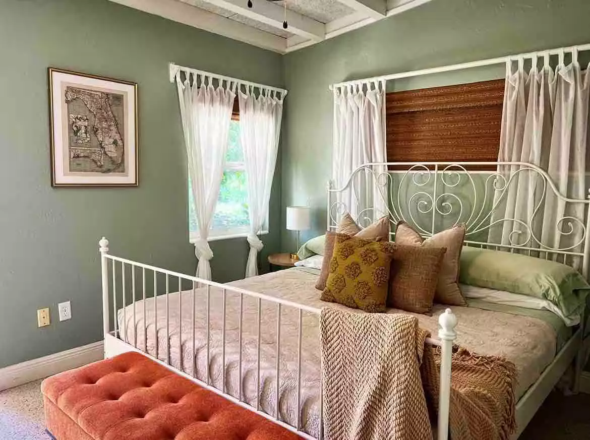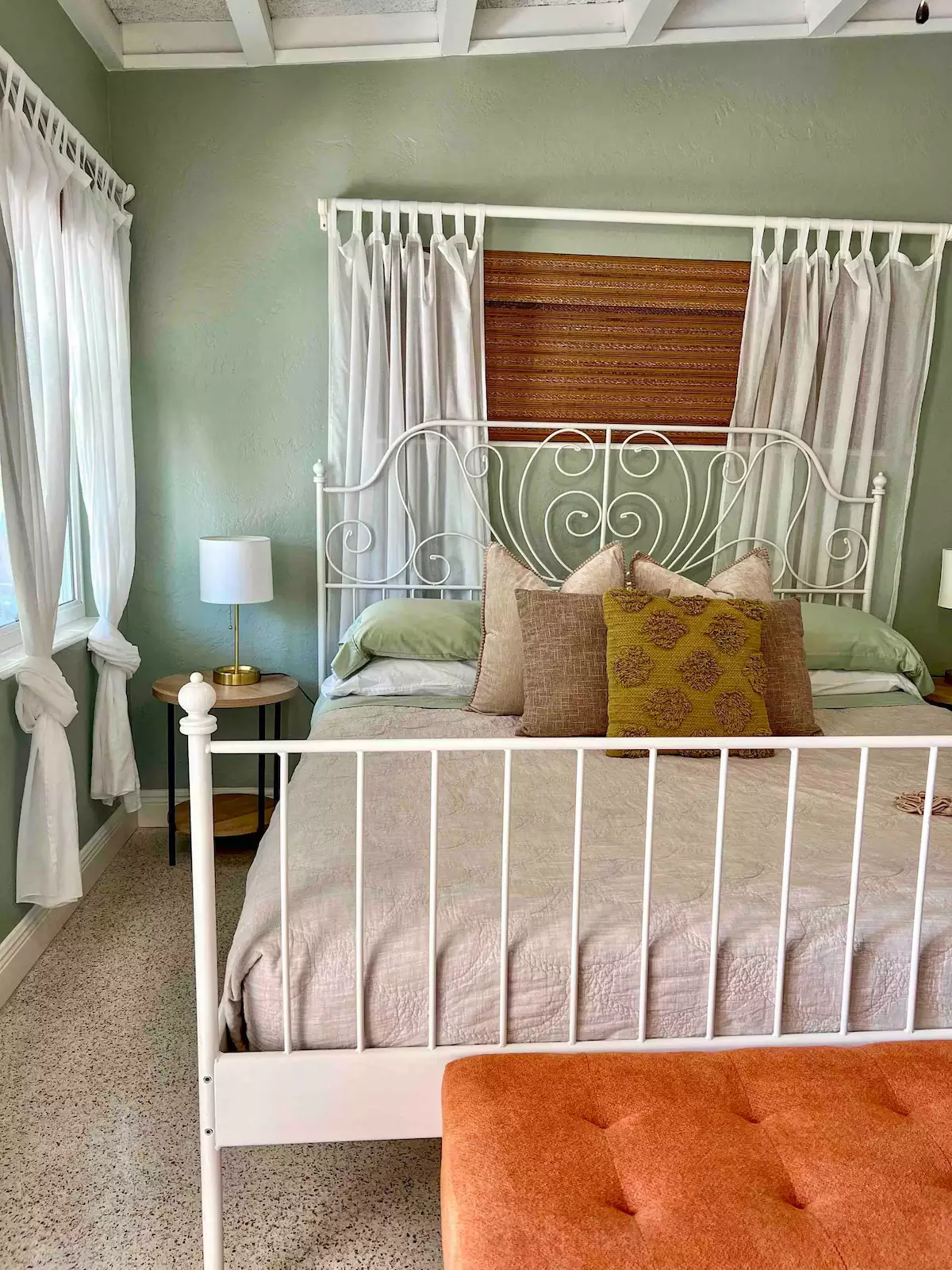 Primary Bedroom: Indulge yourself and book your retreat to Mango IRB, your tranquil slice of beach haven. Unwind in the cozy bedroom, featuring a plush king bed that promises a restful night's sleep. Ample closet space with wood hangers, a dresser, two nightstands, a sound machine, and a tufted orange bench at the foot of the bed offer convenience and elegance. Experience unparalleled comfort and relaxation during your stay! 🌅