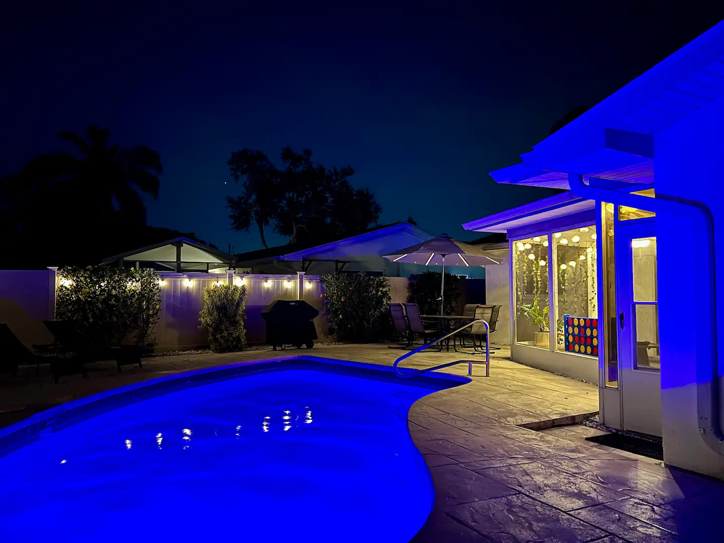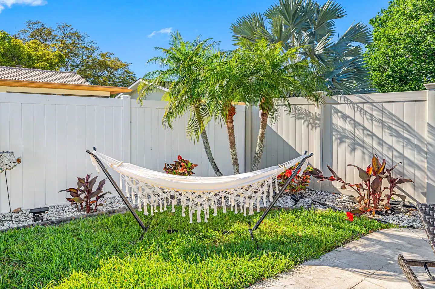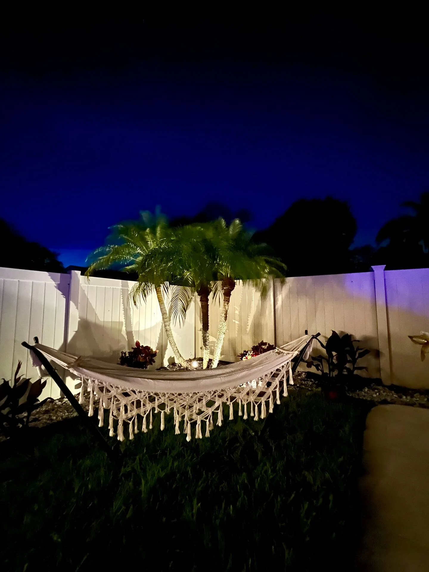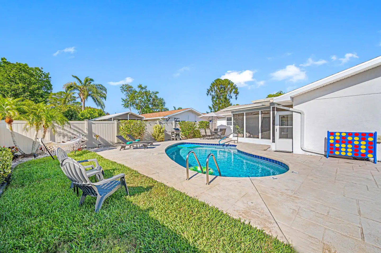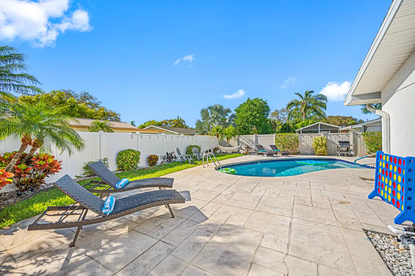 Backyard: Indulge in a tropical oasis featuring a heated pool, a Weber barbecue grill, an outdoor dining area with an umbrella, and a cozy fringe hammock tucked under swaying palms. Relax on the lounge chairs, play a game with the life-size Connect Four, float in the pool, and soak up the sun-filled atmosphere. Experience enjoyable days and tranquil evenings in this welcoming paradise. 💦
