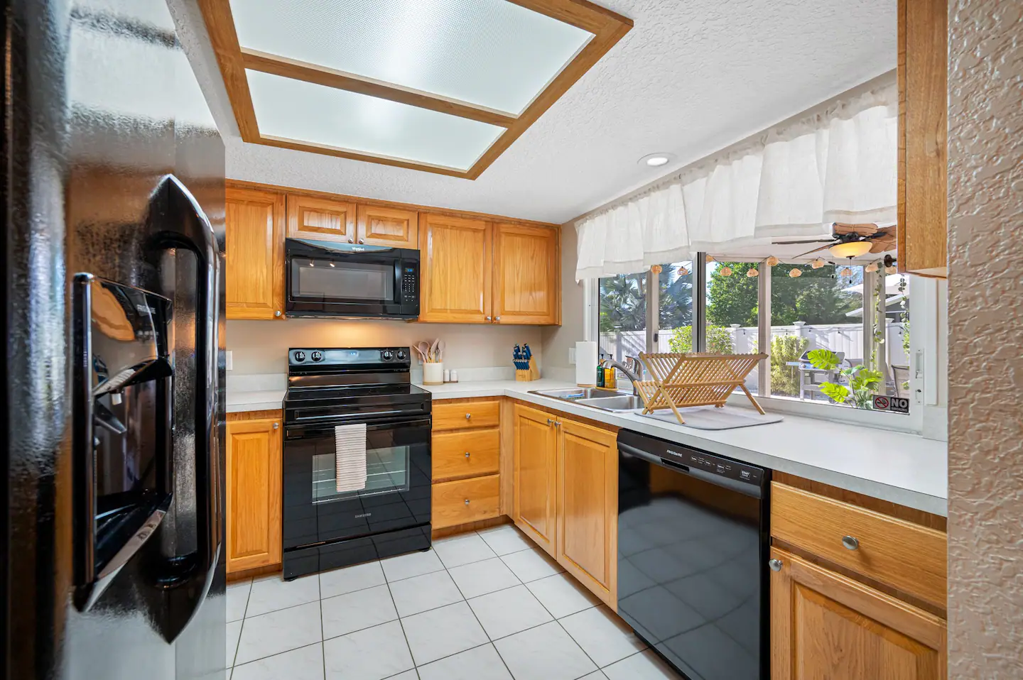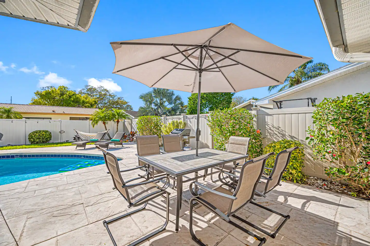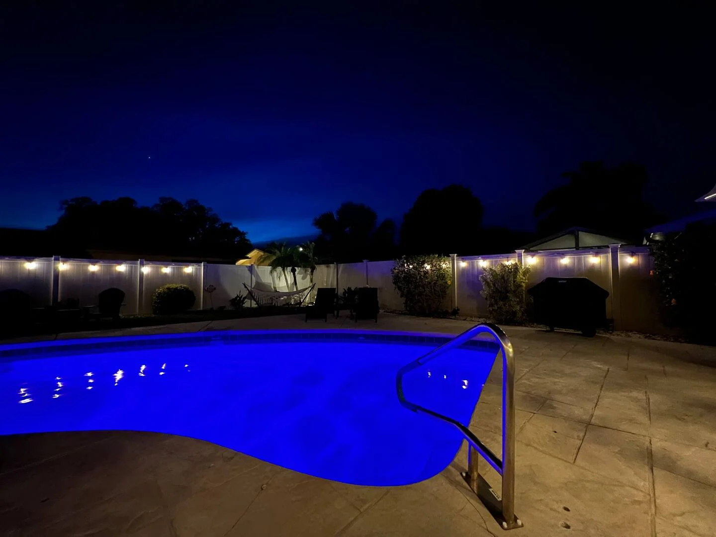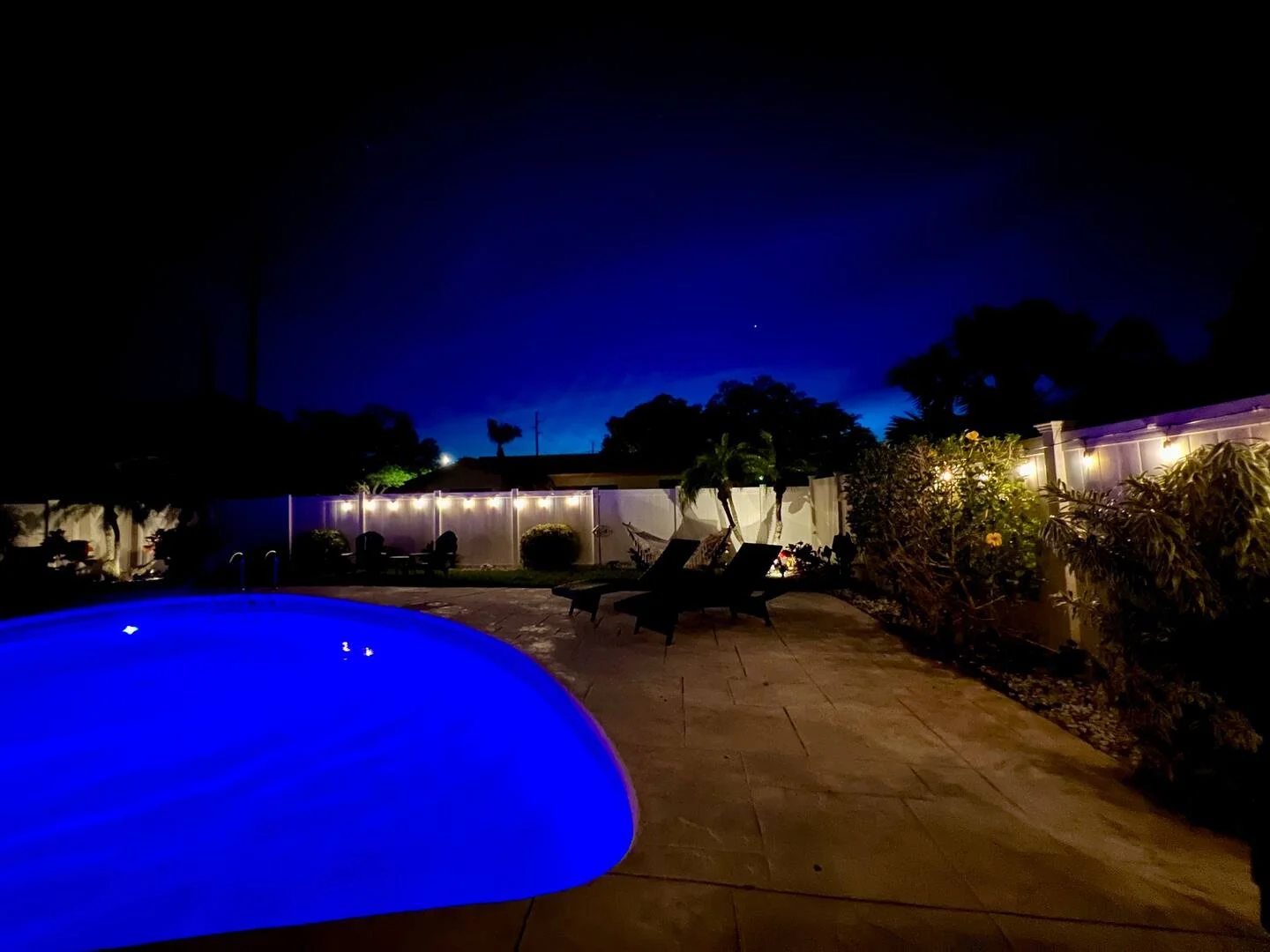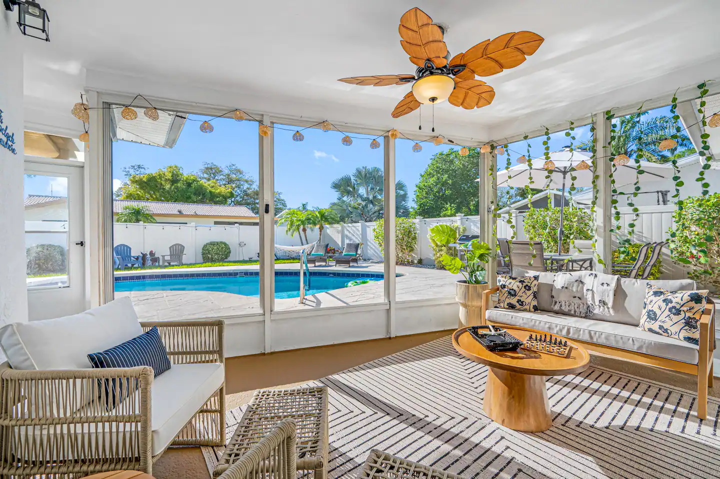 Backyard: Indulge in a tropical oasis featuring a heated pool, a Weber barbecue grill, an outdoor dining area with an umbrella, and a cozy fringe hammock tucked under swaying palms. Relax on the lounge chairs, play a game with the life-size Connect Four, float in the pool, and soak up the sun-filled atmosphere. Experience enjoyable days and tranquil evenings in this welcoming paradise. 💦