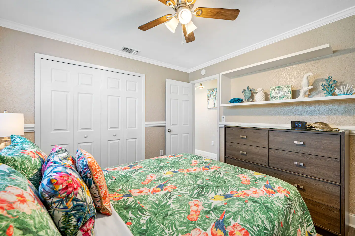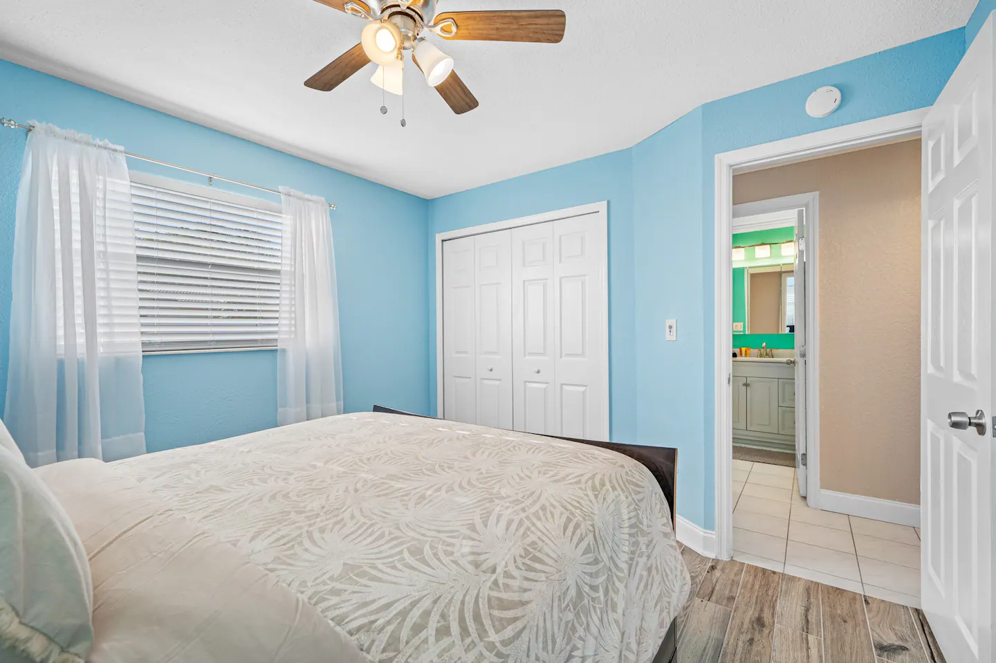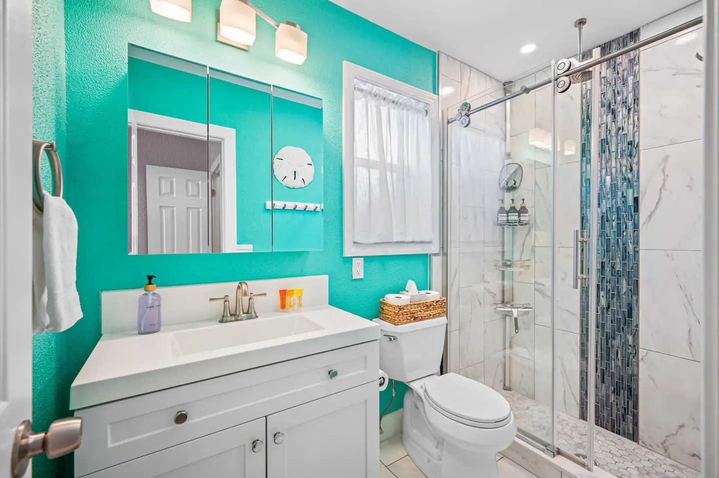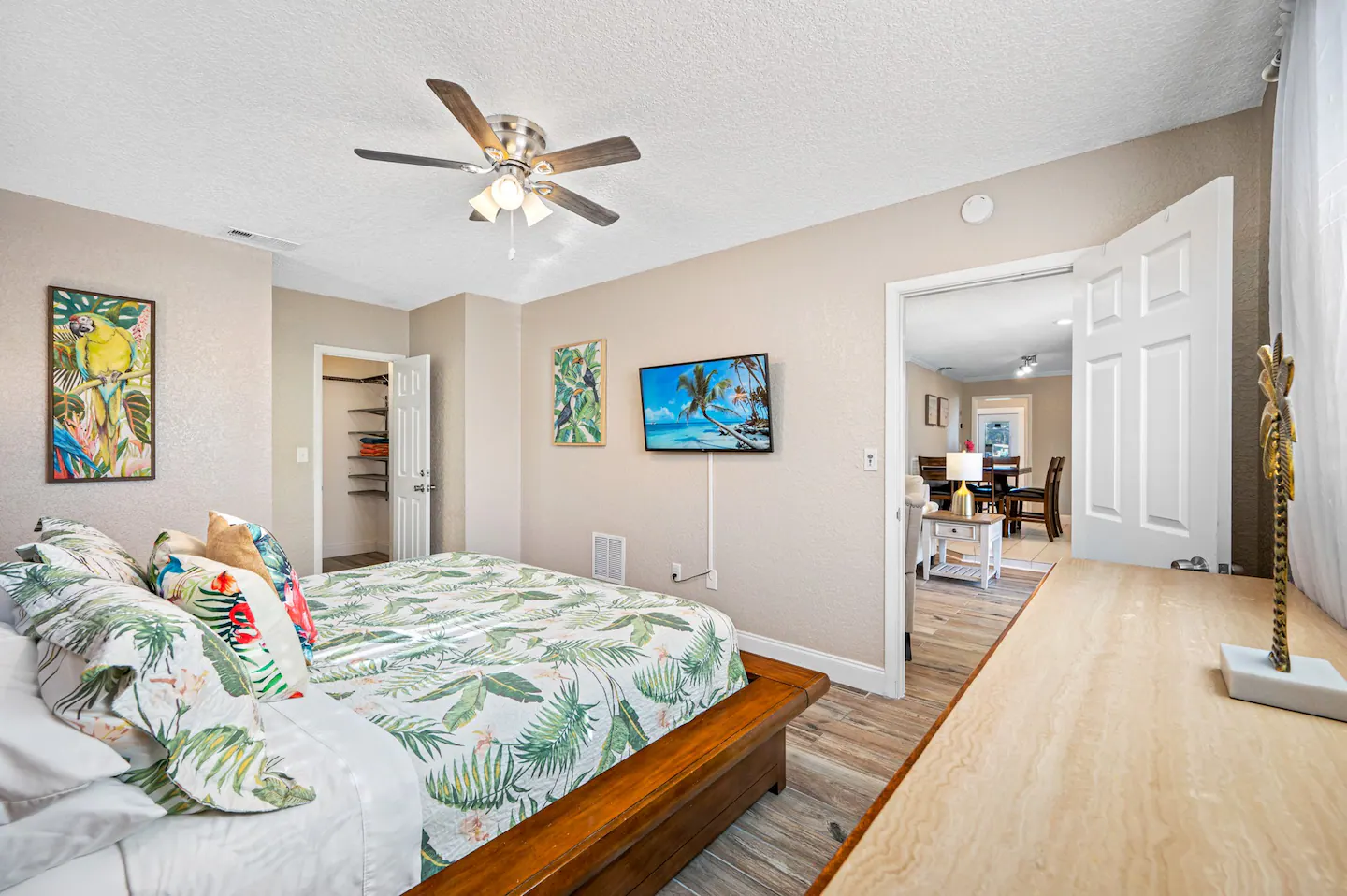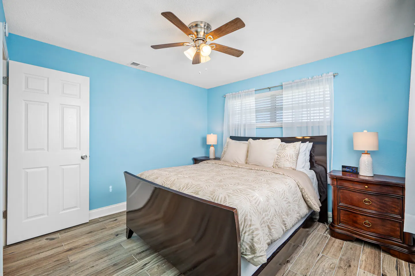 Primary Bedroom & Bathroom: This large bedroom is perfect for a restful night's sleep or a refreshing afternoon nap after a day in the sun. It includes a king-sized bed, two nightstands, a dresser, and plenty of natural light. The walk-in closet is stocked with hangers, while the bathroom features a stand-up shower and necessary amenities such as shampoo, body wash, conditioner, a hairdryer, and Q-tips for your convenience and relaxation. 🌿