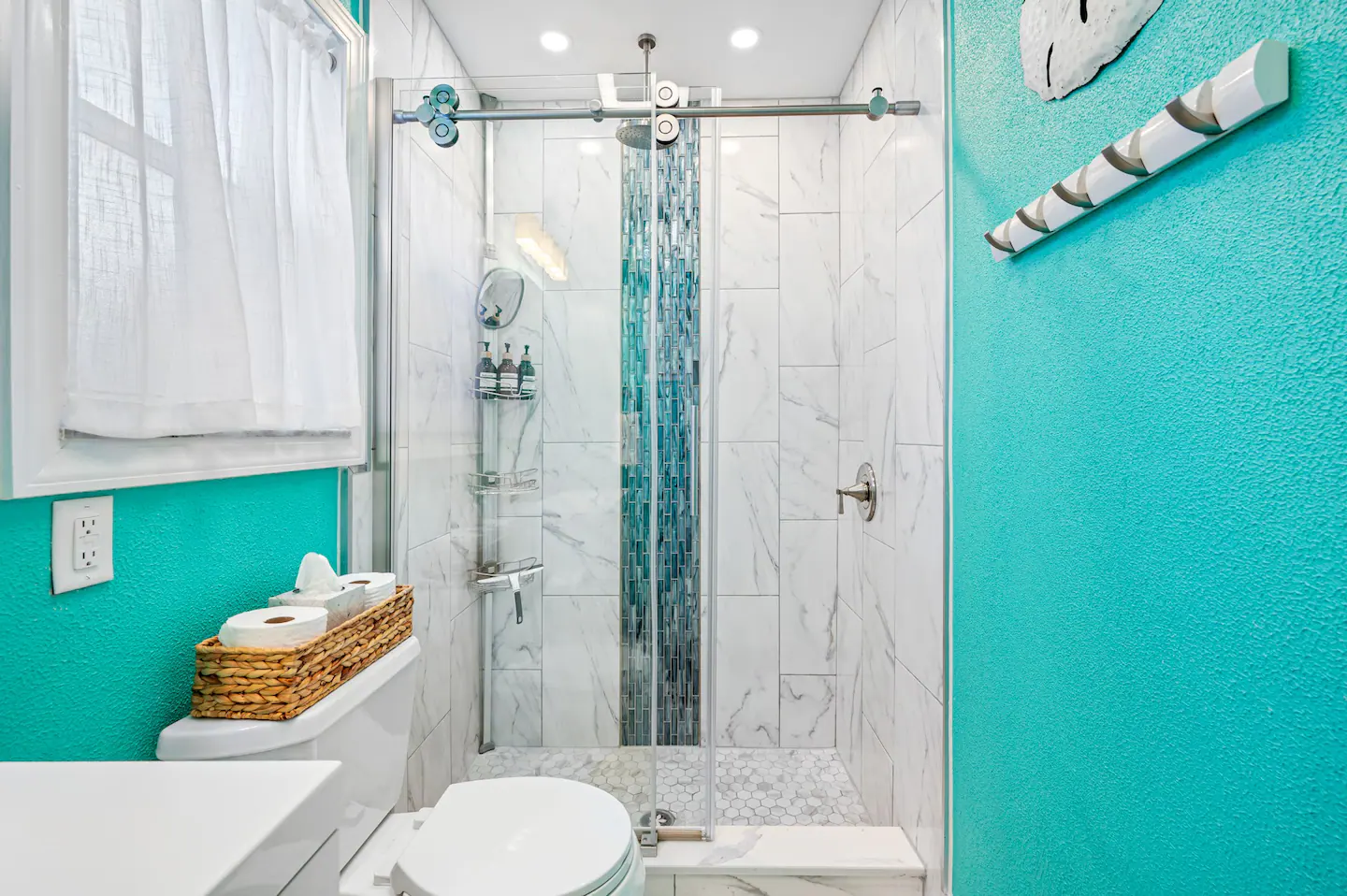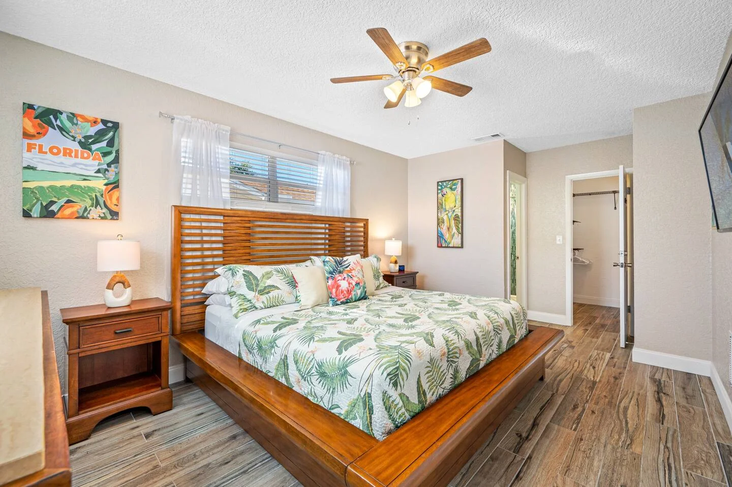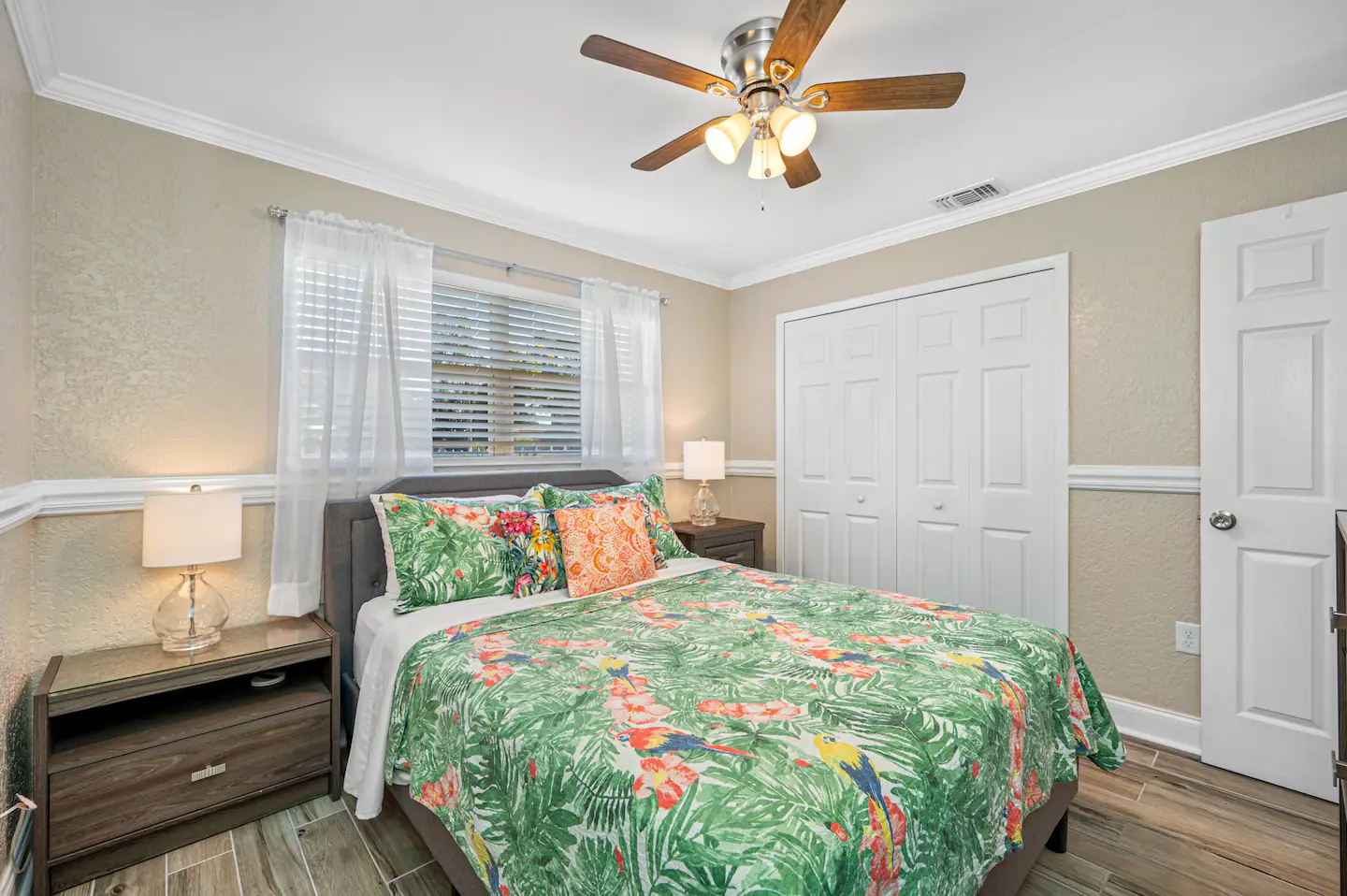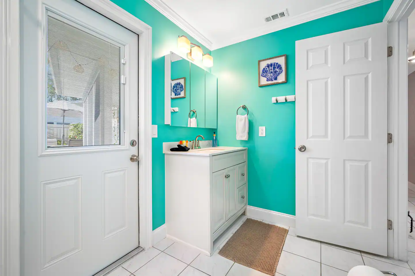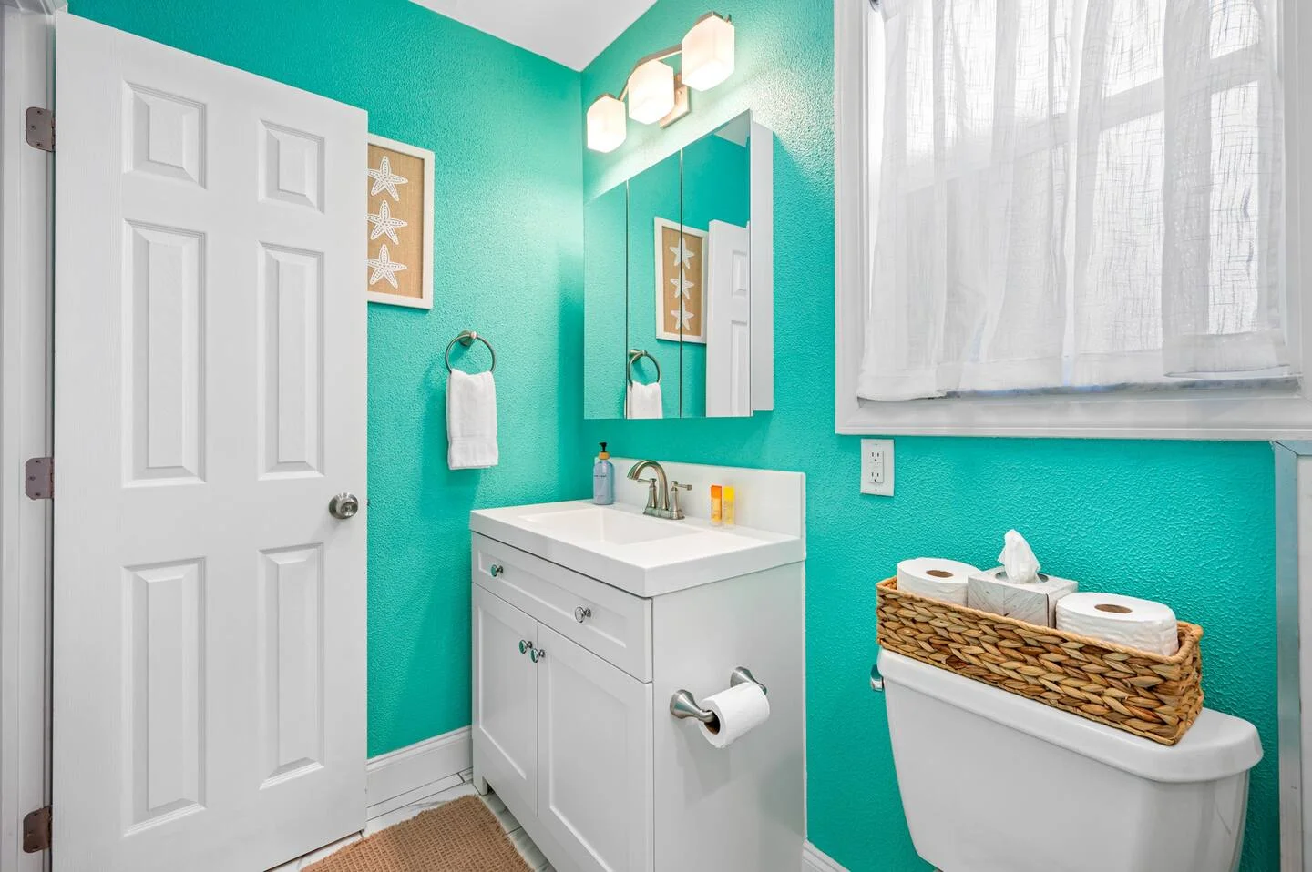 Primary Bedroom & Bathroom: This large bedroom is perfect for a restful night's sleep or a refreshing afternoon nap after a day in the sun. It includes a king-sized bed, two nightstands, a dresser, and plenty of natural light. The walk-in closet is stocked with hangers, while the bathroom features a stand-up shower and necessary amenities such as shampoo, body wash, conditioner, a hairdryer, and Q-tips for your convenience and relaxation. 🌿