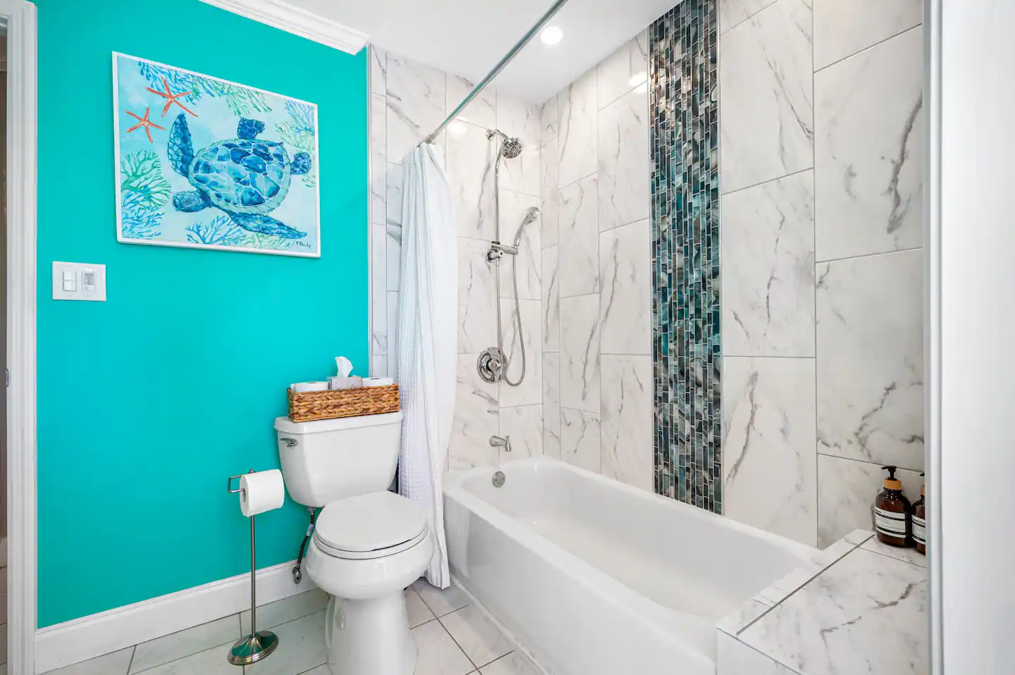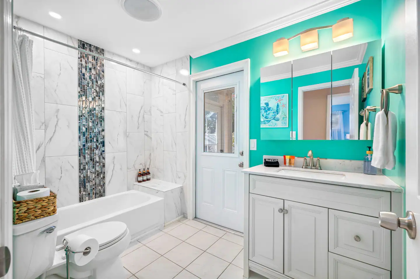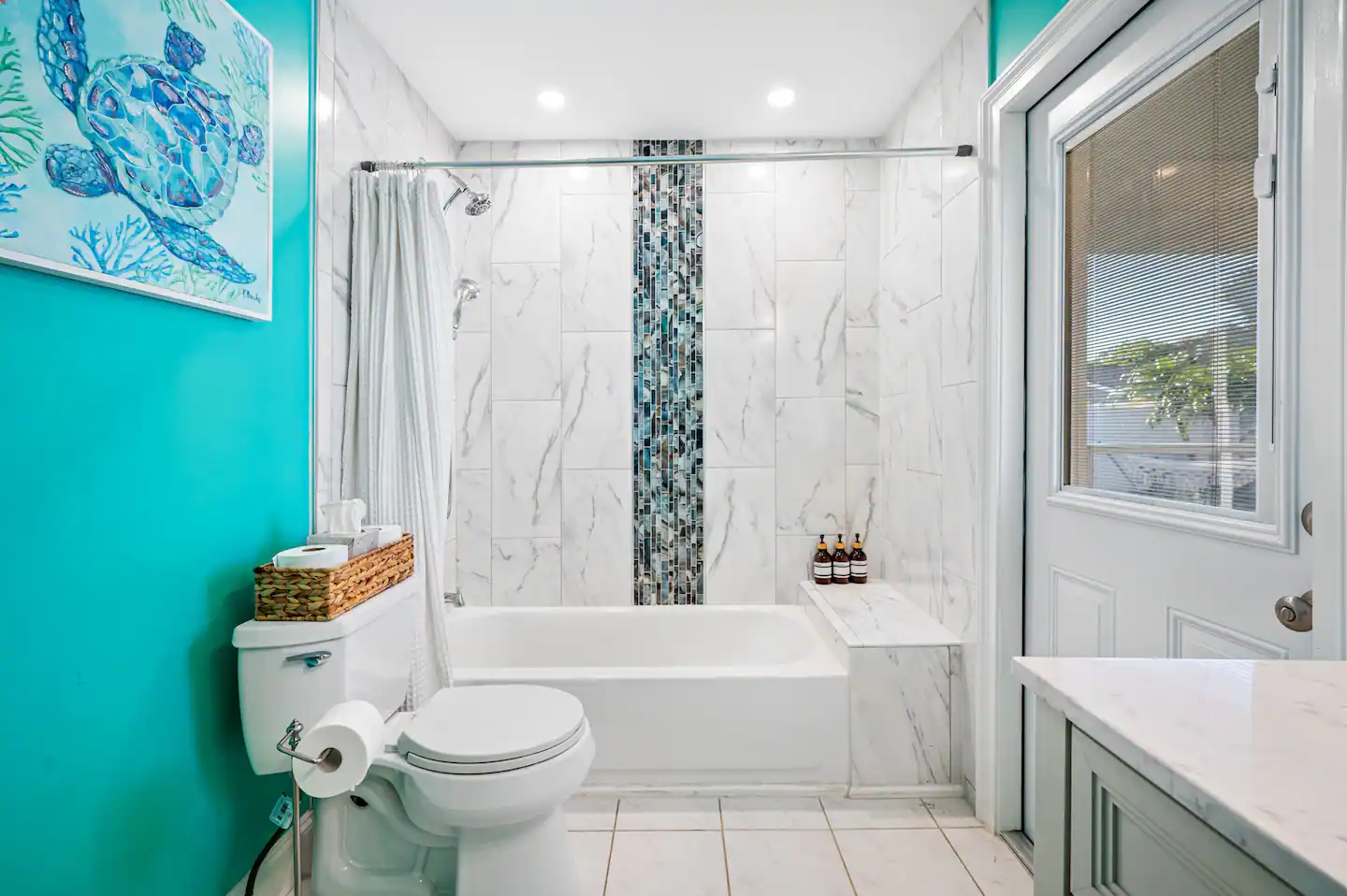 Hallway Bathroom: Step into this roomy bathroom, which combines the best of both worlds with a tub and stand-up shower. It's designed for convenience and situated off the Florida Room and yard. Enjoy the provided amenities, including shampoo, conditioner, body wash, a blow dryer, and Q-tips, creating a tranquil and welcoming space to relax and rejuvenate at your own pace. 🌴