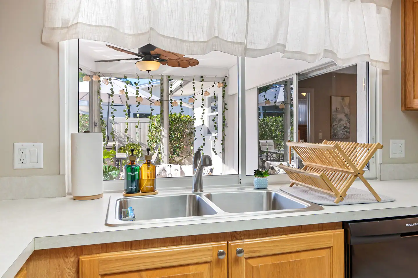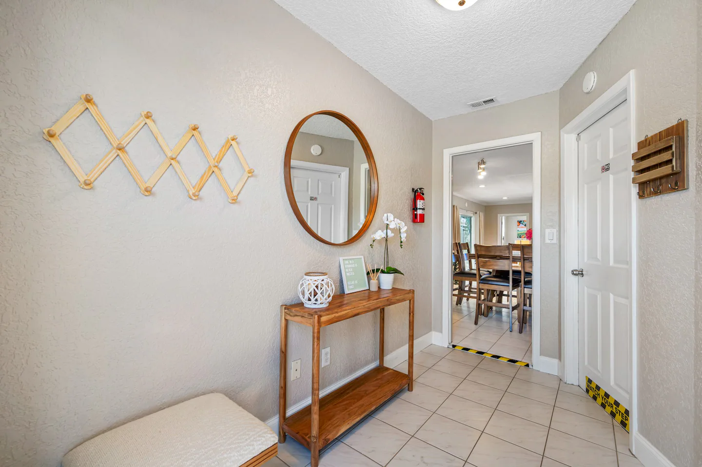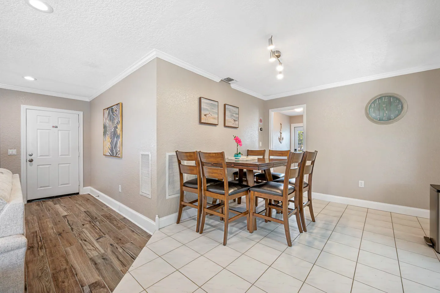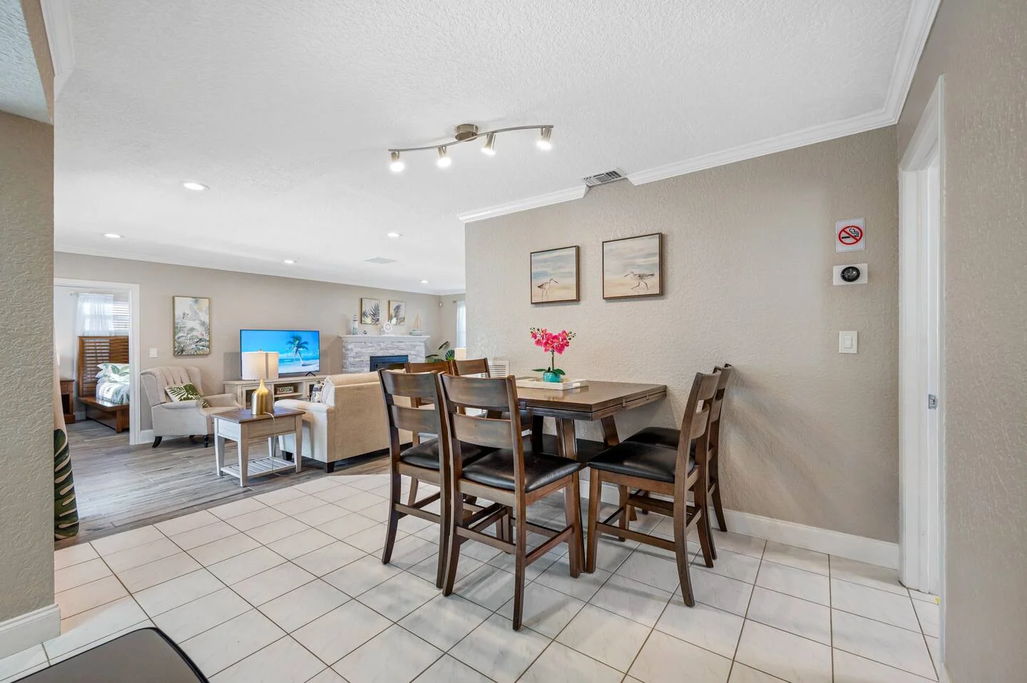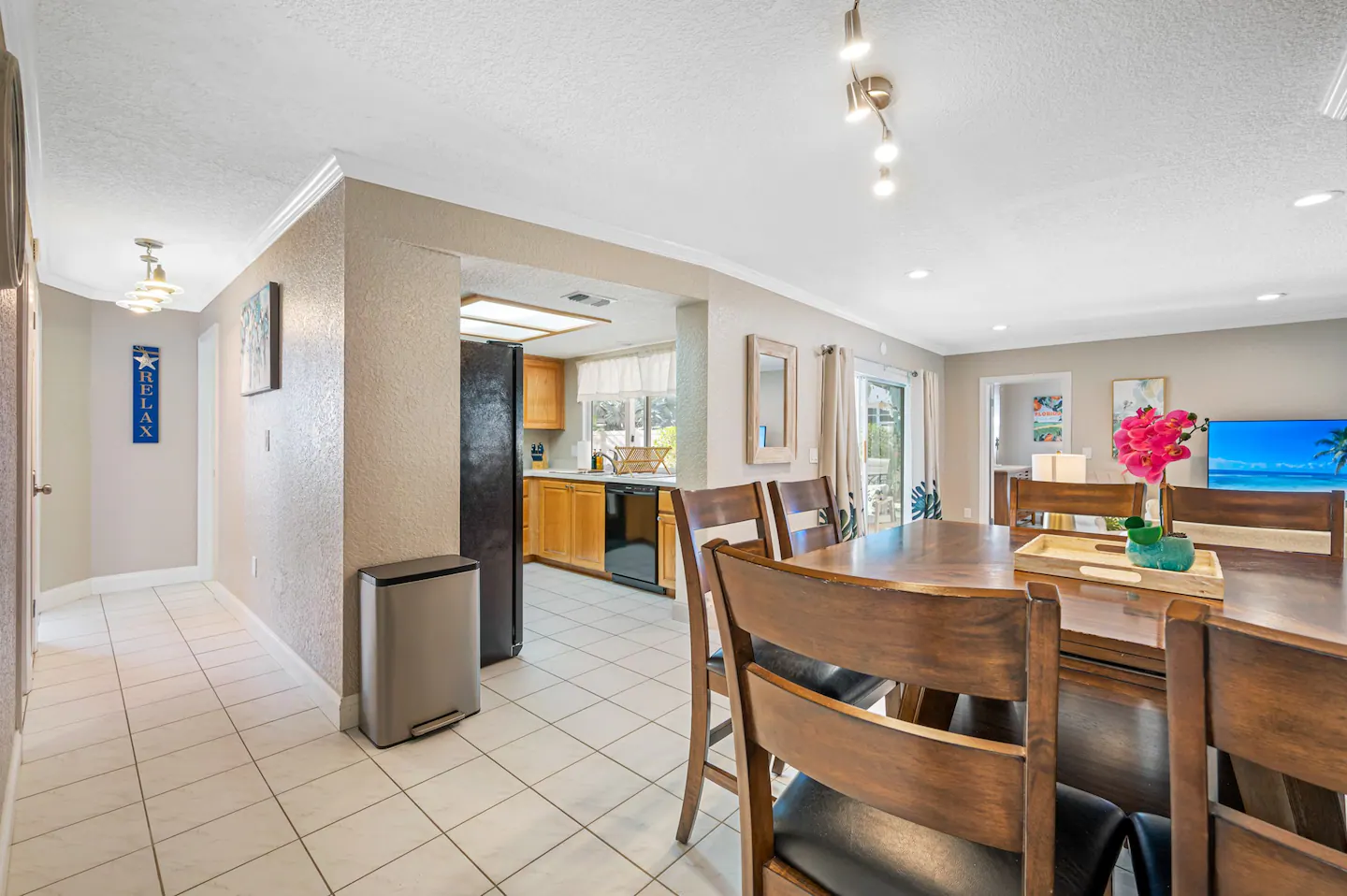 Dining Room/Kitchen: Enhance your dining experience with a large table that comfortably seats six guests. The well-equipped kitchen offers all the essentials, featuring a Keurig coffee station stocked with syrups, sugar packets, and K-cups. Enjoy your meals with a picturesque view from the delightful Florida Room overlooking the beautiful pool area. 🥭
