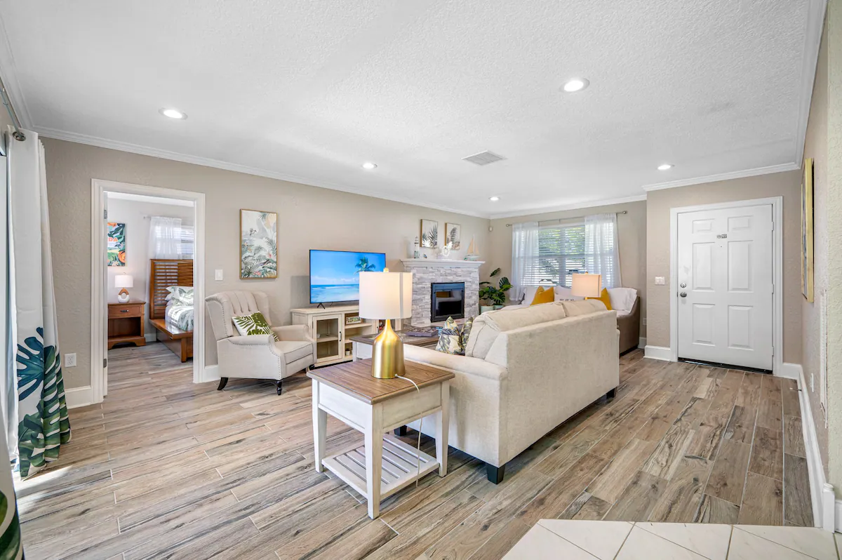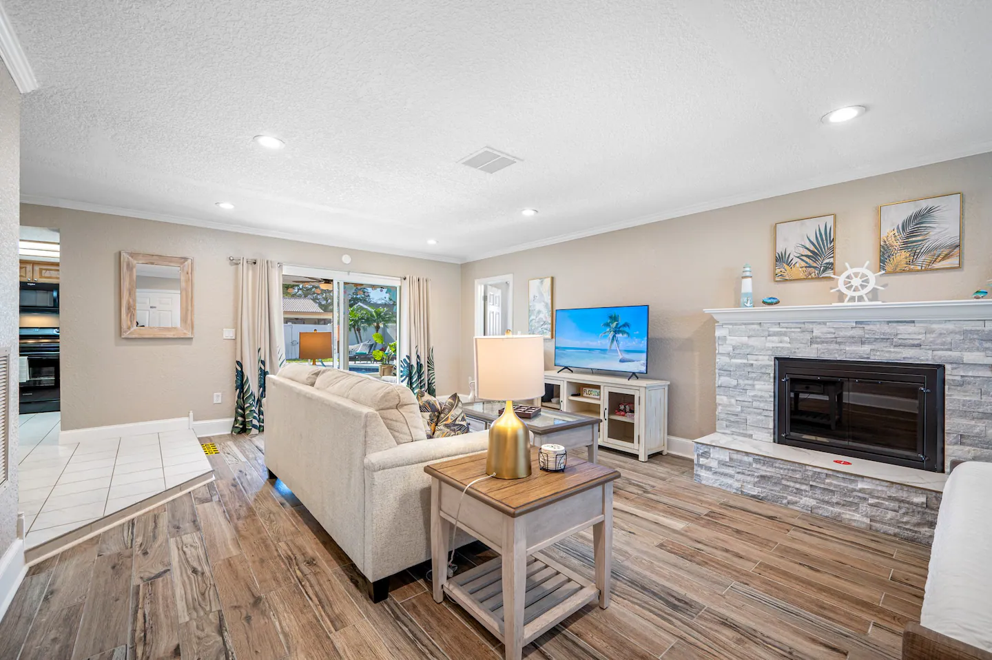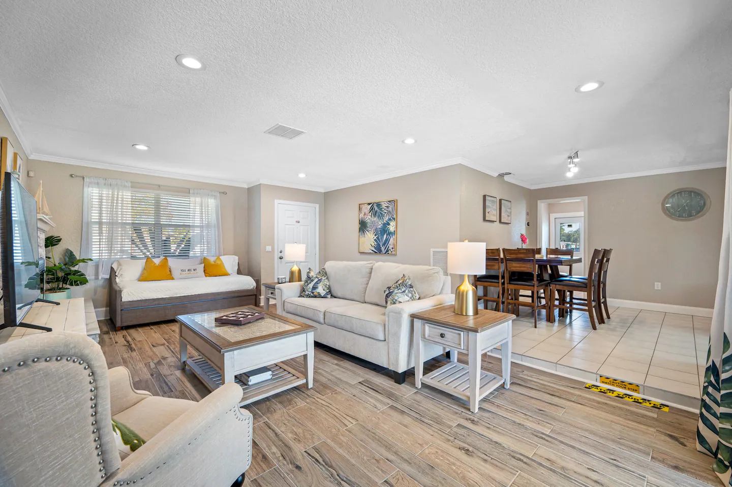 Living Room: Welcome to a welcoming living room featuring a spacious flat-screen TV, a pull-out sofa bed, and a daybed for additional sleeping options. By fully opening the sliding doors, you can expand your living area onto the screened-in patio, seamlessly merging indoor and outdoor living. Relax and indulge in versatile comfort in this cozy space for ultimate relaxation and pleasure. 📺